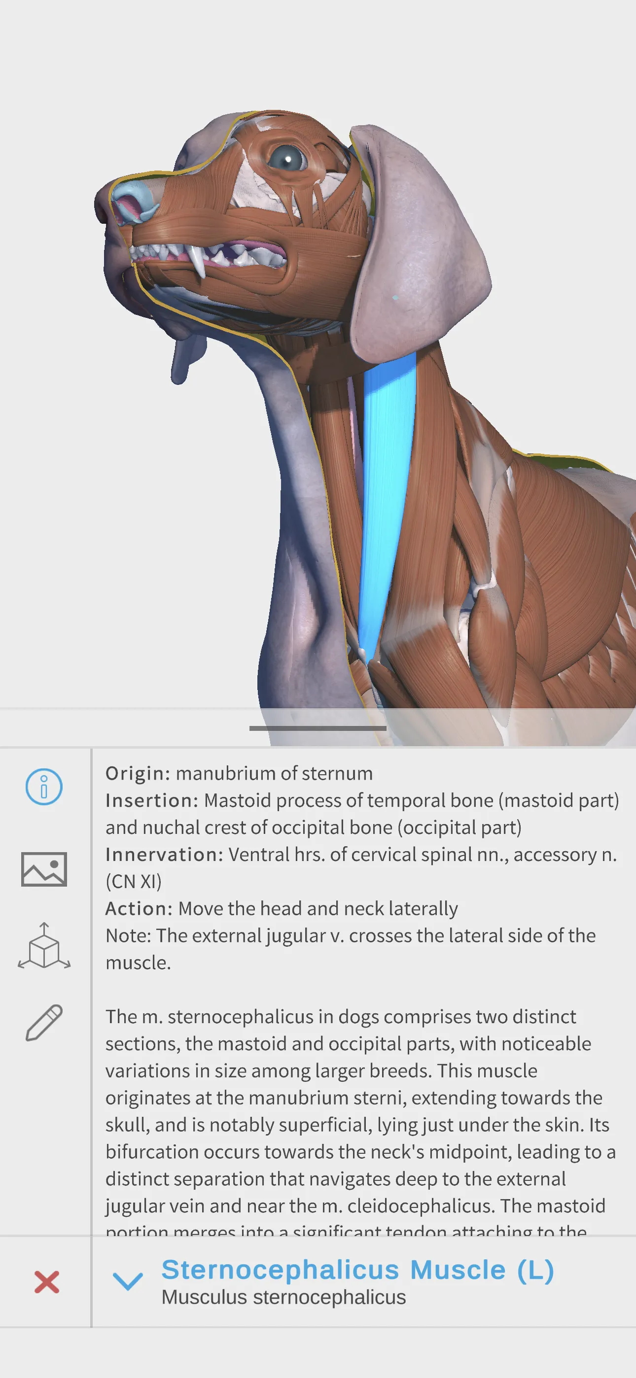 Complete and easy-to-use virtual guide for learning, understanding, and visualizing the complexities of dog and canine anatomy in 3D. Includes information and images for each anatomical system and part, with multiple options to interact with the 3D anatomy models (hiding, fading, etc.), and much more.